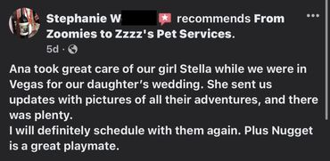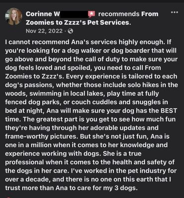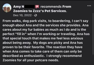 Hi, I'm Ana. I have worked as a professional pet care provider since 2017. Together with my husband Roger, we provide dog boarding in our home, and dog walks from yours. I have always had a passion for providing dogs with time to play, run, and explore outdoors. Dogs bless us with unconditional love and companionship. It's a joy to reward them with the gift of friendship and adventure.